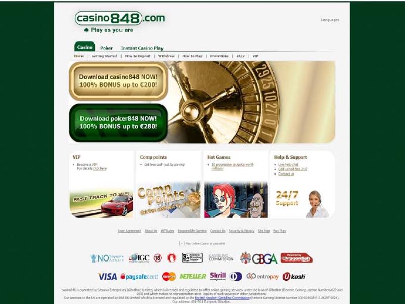 Casino 848 एक पूर्णतः लाइसेंस प्राप्त ऑनलाइन कैसीनो है और 888 होल्डिंग्स समूह का एक हिस्सा है। यह साइट कैसीनो के डाउनलोड करने योग्य और तुरंत खेलने योग्य, दोनों संस्करण प्रदान करती है। खिलाड़ियों को पंजीकरण पर स्वागत Bonus मिलता है और Live चैट, ईमेल या फ़ोन के माध्यम से 24 ग्राहक सेवा उपलब्ध है।