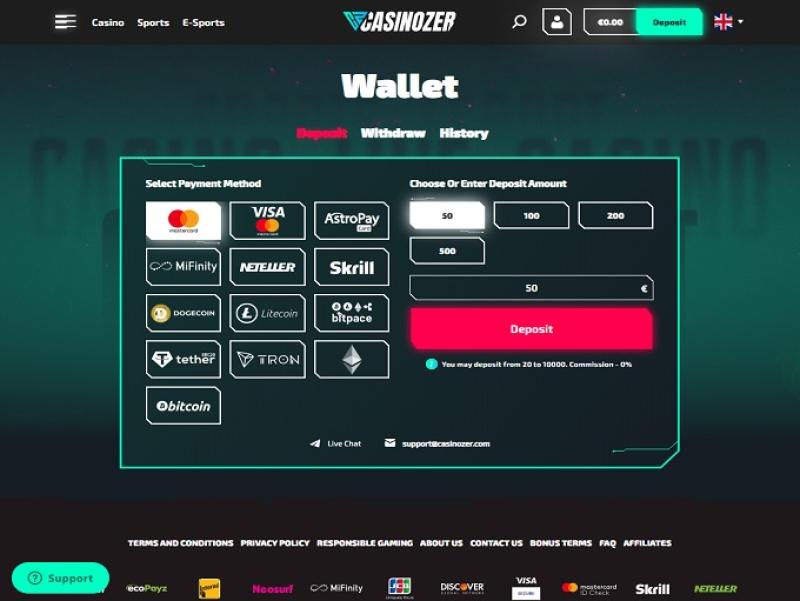 कैसिनोज़र को खिलाड़ी द्वारा चुनी गई भुगतान विधि के आधार पर अधिकतम और न्यूनतम जमा राशि निर्धारित करने और खिलाड़ी द्वारा निर्दिष्ट भुगतान विधि से अलग तरीके से धन हस्तांतरित करने का अधिकार है।