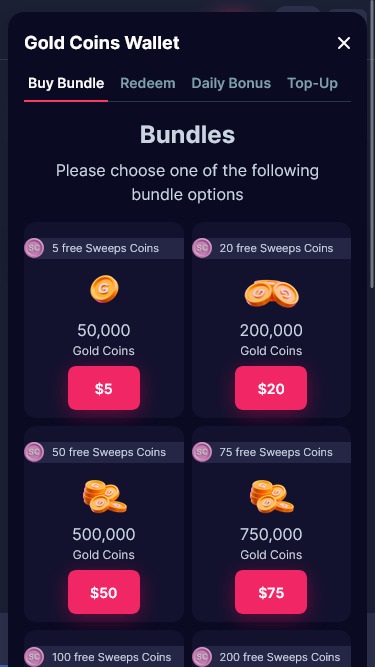 गोल्ड कॉइन कई तरीकों से कमाए जा सकते हैं, जैसे वेलकम बोनस, डेली रिवॉर्ड्स, प्रमोशन, रेस, रैफल्स, रेफ़रल सिस्टम, या फिर गेम्स में दांव लगाकर। इसके अलावा, खिलाड़ी वेबसाइट के स्टोर से बंडल के ज़रिए गोल्ड कॉइन खरीद सकते हैं।
