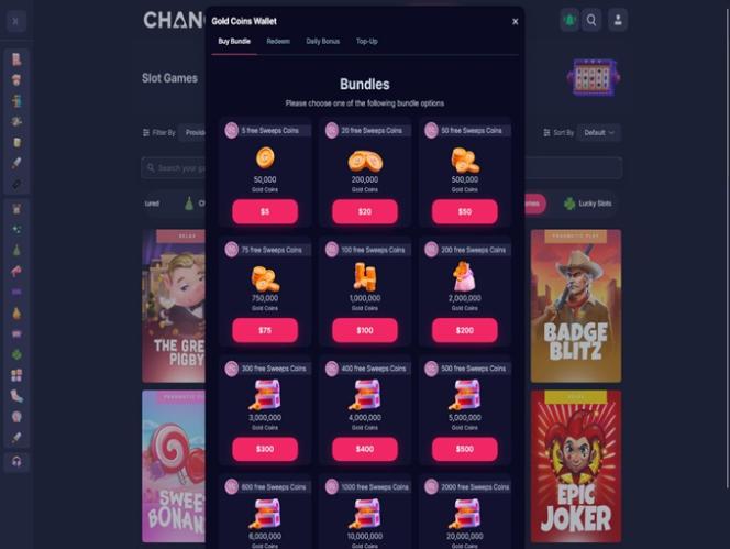 आभासी मुद्राओं के संदर्भ में, चांस्ड कैसीनो अधिकांश सामाजिक और स्वीपस्टेक्स कैसीनो के मानक पैटर्न का पालन करता है। खिलाड़ी दो अलग-अलग मोड में गेम खेल सकते हैं: गोल्ड कॉइन्स और स्वीप कॉइन्स मोड। यदि आप अपने पसंदीदा गेम खेलने के लिए गोल्ड कॉइन्स का उपयोग करना चुनते हैं, तो आप ऐसा केवल मनोरंजन के लिए कर सकते हैं, क्योंकि आप उन्हें मूर्त पुरस्कारों के लिए नहीं बदल पाएंगे।