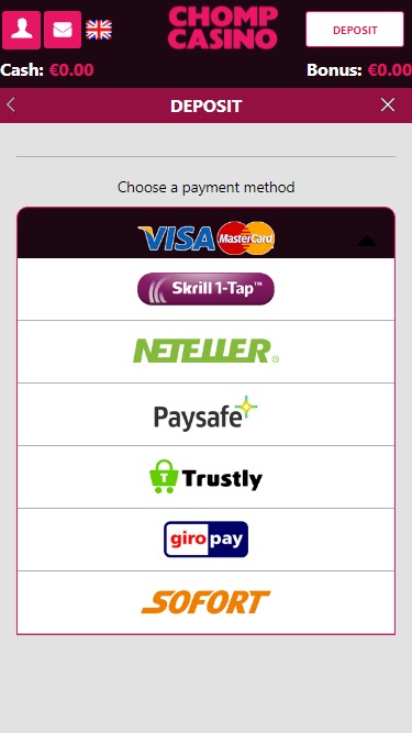 Chomp Casino निम्नलिखित देशों के खिलाड़ियों को स्वीकार नहीं करता है: अफ़ग़ानिस्तान, Alabama, अलैंड द्वीप समूह, अलास्का, अल्बानिया, अल्बर्टा, आइल ऑफ़, एलजीरिया, अमेरिकी समोआ, एंडोरा, अंगोला, एंगुइला, अंटार्कटिका, अण्टीगुआ और बारबूडा, अर्जेंटीना, एरिज़ोना, अर्कांसस, आर्मीनिया, अरूबा, ऑस्ट्रेलिया, ऑस्ट्रिया, आज़रबाइजान, बहामा, बहरीन, बांग्लादेश, बारबाडोस, बेलोरूस, बेल्जियम, बेलीज़, बेनिन, बरमूडा, भूटान, बोलीविया, बोस्निया और हर्जेगोविना, बोत्सवाना, बौवेट द्वीप, ब्राज़िल, ब्रिटिश कोलंबिया, ब्रिटिश हिंद महासागर क्षेत्र, ब्रुनेई, बुल्गारिया, बुर्किना फासो, बुस्र्न्दी, कैलिफोर्निया, कंबोडिया, कैमरून, कनाडा, केप वर्ड, केमन द्वीपसमूह, केन्द्रीय अफ़्रीकी गणराज्य, काग़ज़ का टुकड़ा, चिली, चीन, क्रिसमस द्वीप, कोकोस (कीलिंग) द्वीप समूह, कोलंबिया, कोलोराडो, कोमोरोस, कांगो, कांगो लोकतांत्रिक गणराज्य, कनेक्टिकट, कुक आइलैंड्स, कोस्टा रिका, हाथीदांत का किनारा, क्रोएशिया, क्यूबा, कुराकाओ, साइप्रस, चेक रिपब्लिक, डीसी, डेलावेयर, डेनमार्क, ज़िबूटी, डोमिनिका, डोमिनिकन गणराज्य, इक्वेडोर, मिस्र, अल साल्वाडोर, इक्वेटोरियल गिनी, इरिट्रिया, एस्तोनिया, इथियोपिया, फ़ॉकलैंड द्वीप समूह (माल्विनास), फ़रो द्वीप समूह, फिजी, फिनलैंड, फ्लोरिडा, फ्रांस, फ्रेंच गुयाना, फ़्रेंच पोलिनेशिया, फ्रांसीसी दक्षिणी क्षेत्र, गैबॉन, गाम्बिया, जॉर्जिया, जॉर्जिया, जर्मनी, घाना, जिब्राल्टर, ग्रीस, ग्रीनलैंड, ग्रेनेडा, ग्वाडेलोप, गुआम, ग्वाटेमाला, गिनी, गिनी-बिसाऊ, Guyana, हैती, हवाई, हर्ड द्वीप और मैकडोनाल्ड द्वीप, होंडुरस, हांगकांग, हंगरी, आइसलैंड, इडाहो, इलिनोइस, भारत, इंडियाना, इंडोनेशिया, आयोवा, ईरान, इराक, आयरलैंड, मैन द्वीप, इज़राइल, इटली, जमैका, जापान, जर्सी, जॉर्डन, कान्सास, कजाखस्तान, केंटकी, केन्या, किरिबाती, कोरिया, लोकतांत्रिक जनवादी गणराज्य, कोरिया गणराज्य, कुवैट, किर्गिज़स्तान, लाओस, लातविया, लेबनान, लिसोटो, लाइबेरिया, लीबिया, लिकटेंस्टाइन, लिथुआनिया, लुइसियाना, लक्समबर्ग, मकाउ, मेडागास्कर, मैंने, मलावी, मलेशिया, मालदीव, माली, माल्टा, मैनिटोबा, मार्शल द्वीपसमूह, मार्टीनिक, मैरीलैंड, मैसाचुसेट्स, मॉरिटानिया, मॉरीशस, मैयट, मेक्सिको, मिशिगन, माइक्रोनेशिया, संघीय राज्य, मिनेसोटा, मिसिसिपी, मिसौरी, मोल्दाविया, मोनाको, मंगोलिया, MONTANA, मोंटेनेग्रो, मोंटेसेराट, मोरक्को, मोज़ाम्बिक, म्यांमार, नामिबिया, नाउरू, नेब्रास्का, नेपाल, नीदरलैंड, नीदरलैंड एंटिलीज़, नेवादा, कनाडा का एक प्रांत, नया केलडोनिया, न्यू हैम्पशायर, न्यू जर्सी, न्यू मैक्सिको, न्यूयॉर्क, न्यूज़ीलैंड, न्यूफाउंडलैंड और लैब्राडोर, निकारागुआ, नाइजर, नाइजीरिया, नियू, नॉरफ़ॉक द्वीप, उत्तरी 