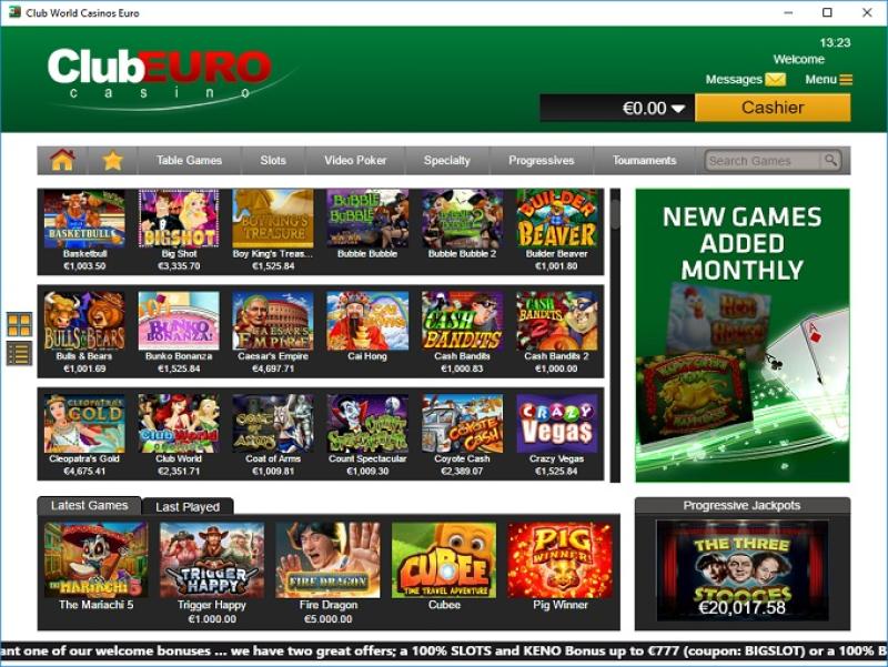 क्लब यूरो कैसीनो में खेलने के लिए ढेरों वीडियो और क्लासिक स्लॉट उपलब्ध हैं, हालाँकि ये गेम बिल्कुल वैसे ही हैं जैसे आपको दुनिया भर के दर्जनों अन्य RTG संचालित कैसीनो में मिलेंगे। बड़ी जीत की चाहत रखने वाले खिलाड़ियों को क्लब यूरो में प्रगतिशील जैकपॉट मिलेंगे, जिनके इनाम सैकड़ों से लेकर लाखों यूरो तक के होंगे।