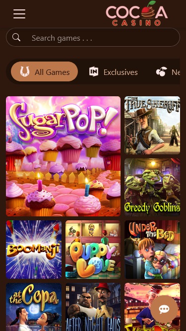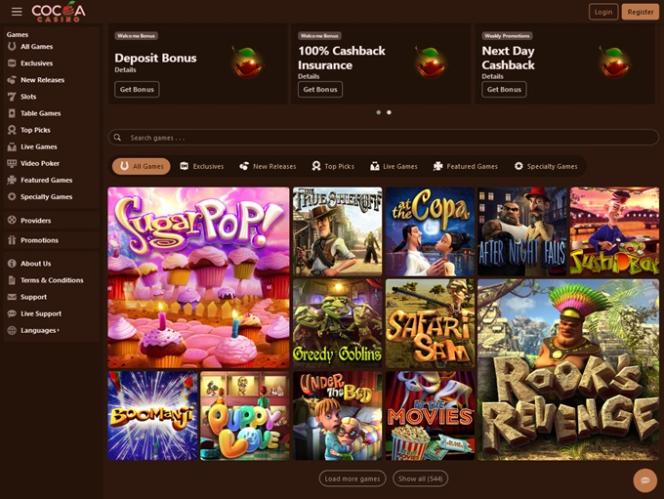 Cocoa Casino BetSoft, Genesis Gaming, Rival, Saucify, Spinomenal, Radi8 Games, Fresh Deck Studios, Woohoo Games, Qora Games, Genii, Wager Gaming, Dragon Gaming and Dragoon Soft द्वारा संचालित है, जो इसे गेम की एक पूरी लाइब्रेरी प्रदान करता है जिसे आप डाउनलोड करने योग्य सॉफ़्टवेयर के साथ-साथ वेब आधारित प्लेटफ़ॉर्म के माध्यम से भी खेल सकते हैं।अन्य खेल