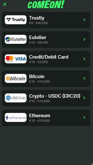 ComeOn Casino निम्नलिखित देशों के खिलाड़ियों को स्वीकार नहीं करता है: अफ़ग़ानिस्तान, Alabama, अलैंड द्वीप समूह, अलास्का, अल्बानिया, अल्बर्टा, आइल ऑफ़, एलजीरिया, अमेरिकी समोआ, एंडोरा, अंगोला, एंगुइला, अंटार्कटिका, अण्टीगुआ और बारबूडा, अर्जेंटीना, एरिज़ोना, अर्कांसस, आर्मीनिया, अरूबा, ऑस्ट्रेलिया, ऑस्ट्रिया, आज़रबाइजान, बहामा, बहरीन, बांग्लादेश, बारबाडोस, बेलोरूस, बेल्जियम, बेलीज़, बेनिन, बरमूडा, भूटान, बोलीविया, बोस्निया और हर्जेगोविना, बोत्सवाना, बौवेट द्वीप, ब्राज़िल, ब्रिटिश कोलंबिया, ब्रिटिश हिंद महासागर क्षेत्र, ब्रुनेई, बुल्गारिया, बुर्किना फासो, बुस्र्न्दी, कैलिफोर्निया, कंबोडिया, कैमरून, केप वर्ड, केमन द्वीपसमूह, केन्द्रीय अफ़्रीकी गणराज्य, काग़ज़ का टुकड़ा, चिली, चीन, क्रिसमस द्वीप, कोकोस (कीलिंग) द्वीप समूह, कोलंबिया, कोलोराडो, कोमोरोस, कांगो, कांगो लोकतांत्रिक गणराज्य, कनेक्टिकट, कुक आइलैंड्स, कोस्टा रिका, हाथीदांत का किनारा, क्रोएशिया, क्यूबा, कुराकाओ, साइप्रस, चेक रिपब्लिक, डीसी, डेलावेयर, ज़िबूटी, डोमिनिका, डोमिनिकन गणराज्य, इक्वेडोर, मिस्र, अल साल्वाडोर, इक्वेटोरियल गिनी, इरिट्रिया, एस्तोनिया, इथियोपिया, फ़ॉकलैंड द्वीप समूह (माल्विनास), फ़रो द्वीप समूह, फिजी, फ्लोरिडा, फ्रांस, फ्रेंच गुयाना, फ़्रेंच पोलिनेशिया, फ्रांसीसी दक्षिणी क्षेत्र, गैबॉन, गाम्बिया, जॉर्जिया, जॉर्जिया, जर्मनी, घाना, जिब्राल्टर, ग्रीस, ग्रीनलैंड, ग्रेनेडा, ग्वाडेलोप, गुआम, ग्वाटेमाला, गिनी, गिनी-बिसाऊ, Guyana, हैती, हवाई, हर्ड द्वीप और मैकडोनाल्ड द्वीप, होंडुरस, हांगकांग, हंगरी, आइसलैंड, इडाहो, इलिनोइस, भारत, इंडियाना, इंडोनेशिया, आयोवा, ईरान, इराक, आयरलैंड, मैन द्वीप, इज़राइल, इटली, जमैका, जापान, जर्सी, जॉर्डन, कान्सास, कजाखस्तान, केंटकी, केन्या, किरिबाती, कोरिया, लोकतांत्रिक जनवादी गणराज्य, कोरिया गणराज्य, कुवैट, किर्गिज़स्तान, लाओस, लातविया, लेबनान, लिसोटो, लाइबेरिया, लीबिया, लिकटेंस्टाइन, लिथुआनिया, लुइसियाना, लक्समबर्ग, मकाउ, मेडागास्कर, मैंने, मलावी, मलेशिया, मालदीव, माली, माल्टा, मैनिटोबा, मार्शल द्वीपसमूह, मार्टीनिक, मैरीलैंड, मैसाचुसेट्स, मॉरिटानिया, मॉरीशस, मैयट, मेक्सिको, मिशिगन, माइक्रोनेशिया, संघीय राज्य, मिनेसोटा, मिसिसिपी, मिसौरी, मोल्दाविया, मोनाको, मंगोलिया, MONTANA, मोंटेनेग्रो, मोंटेसेराट, मोरक्को, मोज़ाम्बिक, म्यांमार, नामिबिया, नाउरू, नेब्रास्का, नेपाल, नीदरलैंड, नीदरलैंड एंटिलीज़, नेवादा, कनाडा का एक प्रांत, नया केलडोनिया, न्यू हैम्पशायर, न्यू जर्सी, न्यू मैक्सिको, न्यूयॉर्क, न्यूज़ीलैंड, न्यूफाउंडलैंड और लैब्राडोर, निकारागुआ, नाइजर, नाइजीरिया, नियू, नॉरफ़ॉक द्वीप, उत्तरी केरोलिना, नॉर्थ डकोटा, उत