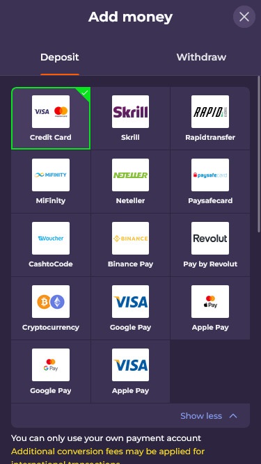 खिलाड़ियों को केवाईसी प्रक्रिया के एक भाग के रूप में पहली निकासी के लिए व्यक्तिगत दस्तावेज प्रस्तुत करने की आवश्यकता हो सकती है।