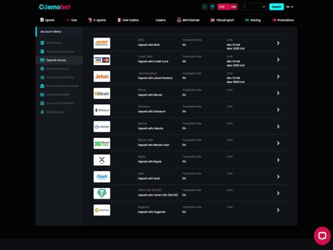 और अंत में, हमें यह बताना होगा कि कॉस्मोबेट कैसीनो में कई सट्टेबाजी प्रणालियाँ भी हैं। स्पोर्ट्सबुक अक्सर सबसे लोकप्रिय गेमिंग प्लेटफ़ॉर्म का हिस्सा होते हैं, और यहाँ सट्टेबाज़ों के पास सट्टा लगाने के लिए कई लोकप्रिय खेल और ई-स्पोर्ट्स उपलब्ध हैं, जिनमें लाइव मैचों में निवेश करने की सुविधा भी शामिल है। वर्चुअल स्पोर्ट्स और घुड़दौड़ पर भी सट्टा लगाने की सुविधा उपलब्ध है, जो इसे एक बेहद सक्षम सट्टेबाजी प्लेटफ़ॉर्म बनाता है।