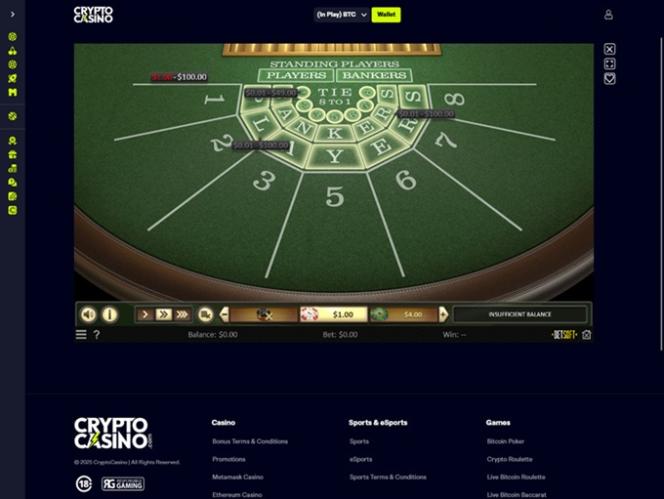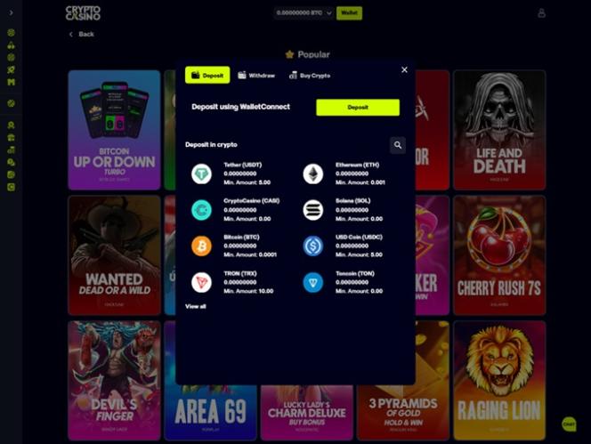 जैसा कि ब्रांड के नाम से पता चलता है, क्रिप्टोकैसीनो एक क्रिप्टो-उन्मुख जुआ साइट है जो खिलाड़ियों को जमा और निकासी के लिए अपनी प्राथमिक बैंकिंग पद्धति के रूप में कई क्रिप्टोकरेंसी का उपयोग करने की अनुमति देती है। कुछ उपलब्ध विकल्पों में बिटकॉइन , बिटकॉइन कैश , कार्डानो , डॉगकॉइन , एथेरियम , लाइटकॉइन , सोलाना , टीथर , ट्रॉन , रिपल , यूएसडी कॉइन और टोनकॉइन शामिल हैं।