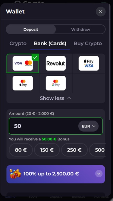 कैसीनो की क्रिप्टो प्रकृति के कारण साइन-अप प्रक्रिया बेहद तेज़ थी और इसमें कोई परेशानी नहीं हुई। जैसा कि बताया गया है, हमने तुरंत एक खाता पंजीकृत कर लिया और जैसे ही हमने ईमेल पता सत्यापित किया, एक पॉप-अप विंडो हमें जमा राशि जमा करने के लिए प्रेरित करने लगी। प्रक्रिया आसान थी और कनेक्शन सुरक्षित था।