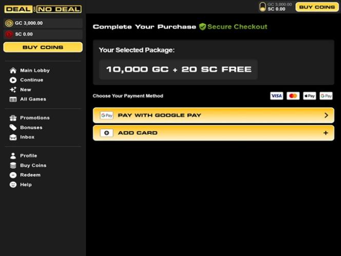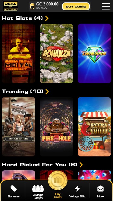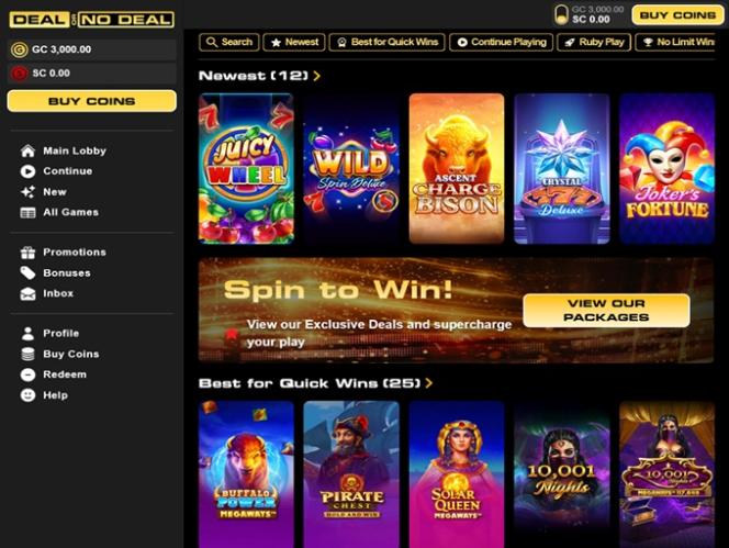 डील ऑर नो डील विन का प्रमोशनल सेटअप इस आकार के प्लेटफॉर्म के लिए काफी अच्छा है। नए खिलाड़ियों को रजिस्ट्रेशन पर गोल्ड कॉइन्स और स्वीप्स कॉइन्स का वेलकम बोनस मिलता है, जिससे उन्हें अपनी यात्रा शुरू करने के लिए पर्याप्त मुद्रा मिल जाती है।