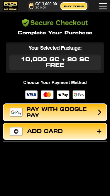 डील ऑर नो डील विन को 2024 में एक स्वीपस्टेक्स ब्रांड के रूप में लॉन्च किया गया था, जो इस मशहूर गेम शो के रोमांच को सोशल गेमिंग की दुनिया में लेकर आया है। इस साइट पर कैसीनो-स्टाइल स्लॉट, इंस्टेंट-क्रैश गेम और लोकप्रिय लाइव गेम शो का बढ़िया मिश्रण मौजूद है। अमेरिका भर के खिलाड़ी इस प्लेटफॉर्म का इस्तेमाल कर सकते हैं, हालांकि कैलिफोर्निया, कनेक्टिकट, डेलावेयर, इडाहो, लुइसियाना, मिशिगन, मोंटाना, नेवादा, न्यू जर्सी, न्यूयॉर्क और वाशिंगटन सहित कई राज्यों में अभी भी इस पर प्रतिबंध है।