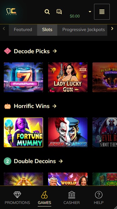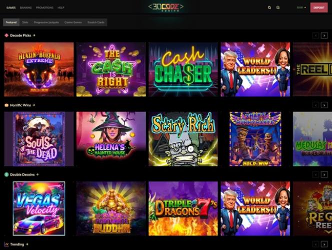 डिकोड द्वारा होस्ट किया गया स्लॉट संग्रह दो हज़ार से ज़्यादा टाइटल प्रदान करता है। खिलाड़ियों को अमेरिका के अनुकूल स्लॉट गेम्स जैसे एल्विस फ्रॉग इन वेगास, फ्रूट ब्लिट्ज़ होल्ड एंड विन, हॉट ट्रिपल सेवन्स, लाफिंग बुद्धा, शो मास्टर, स्केरी रिच 3, हाउलिंग वॉल्व्स, फेयरीटेल कॉवन, बिग कैश विन, बिग वाइल्ड बफ़ेलो, हुक्ड, स्फिंक्स फॉर्च्यून होल्ड एंड विन, वाइल्ड एनर्जी, बोनान्ज़ा बिलियन, साइकिल ऑफ़ लक बोनस बाय, वुल्फ गोल्ड, व्हील ऑफ़ चांस II - द बिग व्हील, स्वीट बोनान्ज़ा, जोकर्स ज्वेल्स, जॉनी कैश, बूमिंग बनानाज़, बुक ऑफ़ टॉम्ब्स, वाइल्ड डायमंड 7x, डिस्को बार 7s, आदि को आज़माने का मौका मिलेगा।