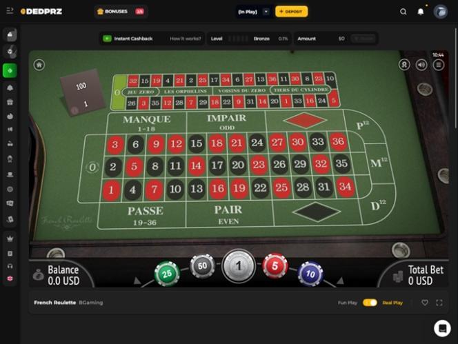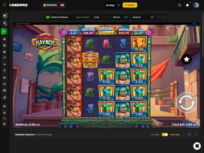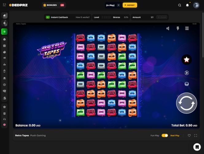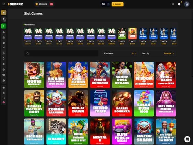 DEDPRZ भी इससे अलग नहीं है। इसके प्लेटफ़ॉर्म में एक न्यूनतम कैसीनो के सभी अपेक्षित तत्व मौजूद हैं, और यह सीधे मुद्दे पर पहुँचकर उपयोगकर्ताओं को वेबसाइट पर बिना किसी परेशानी और ज़्यादा मेहनत के काम करने की सुविधा देने का बेहतरीन काम करता है। गहरे रंग की पृष्ठभूमि को कई नीऑन रंगों के साथ कंट्रास्ट किया गया है जो कैसीनो के अन्य सेक्शन और पेजों को उचित रूप से उभारते हैं।