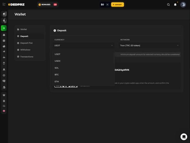 DEDPRZ कैसीनो एक क्रिप्टो-विशिष्ट प्लेटफ़ॉर्म है जो जमा और निकासी के लिए केवल क्रिप्टोकरेंसी को ही मान्य भुगतान विधियों के रूप में स्वीकार करता है। वैकल्पिक लेनदेन विकल्पों में बिटकॉइन , एथेरियम , सोलाना , टीथर , ट्रॉन और यूएसडी कॉइन जैसी कई मुद्राएँ शामिल हैं। दुर्भाग्य से, क्रेडिट कार्ड और इलेक्ट्रॉनिक वॉलेट जैसे पारंपरिक बैंकिंग विकल्प उपलब्ध नहीं हैं।