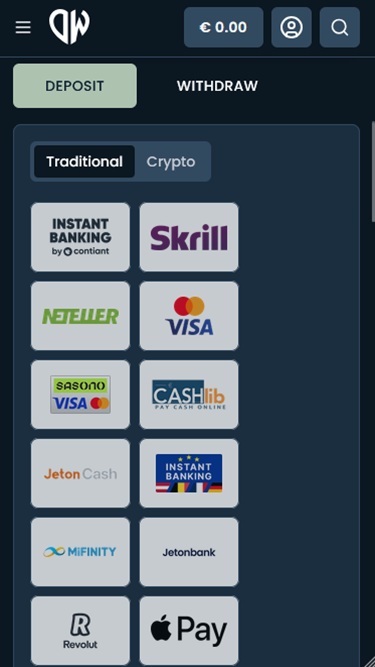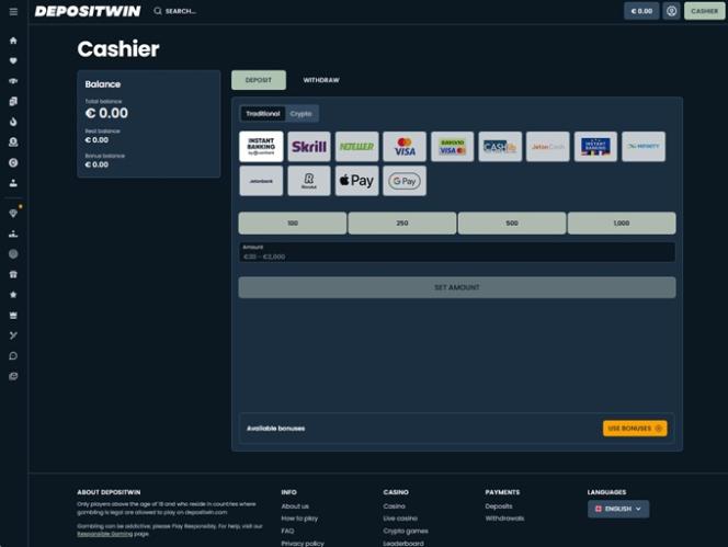 डिपॉज़िटविन कैसीनो में बैंकिंग के कई विकल्प उपलब्ध हैं। खिलाड़ी वीज़ा, मास्टरकार्ड, एस्ट्रोपे, जेटन कैश, मिफ़िनिटी, कैशलिब और कई अन्य माध्यमों से जमा करने का विकल्प चुन सकते हैं। क्रिप्टोकरेंसी से भुगतान करने का विकल्प भी उपलब्ध है, क्योंकि पिछले कुछ वर्षों में यह एक चलन रहा है। हमें यह पसंद है कि यहाँ कई विकल्प उपलब्ध हैं।