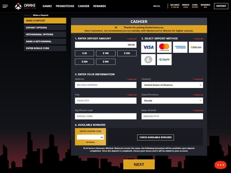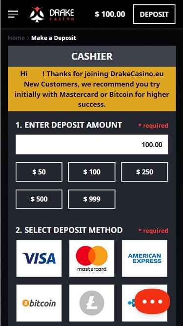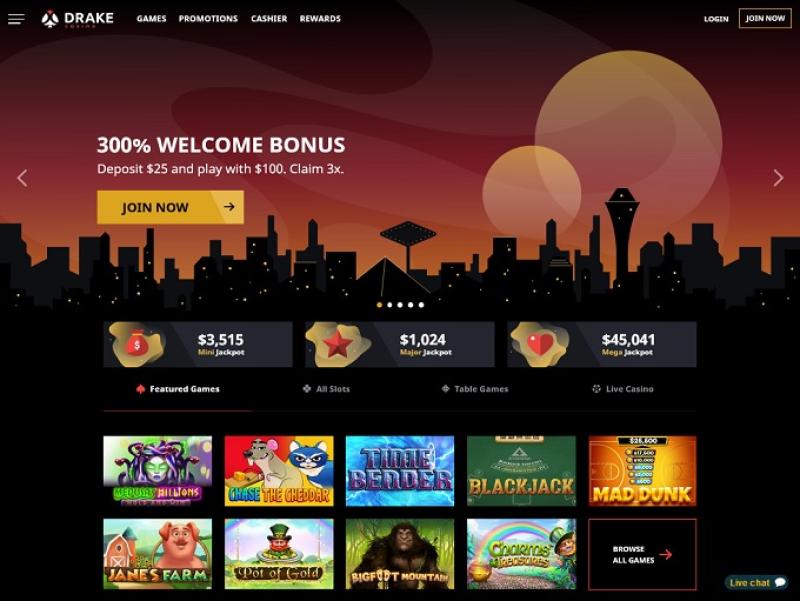 पिछले कुछ वर्षों में Drake Casino एक प्रतिष्ठित ऑनलाइन कैसीनो बन गया है, लेकिन खिलाड़ी 100 डॉलर की न्यूनतम निकासी राशि से विमुख हो सकते हैं, जो कि थोड़ी अधिक है, क्योंकि कैसीनो केवल 25 डॉलर से शुरू होने वाली जमा राशि को स्वीकार करता है।