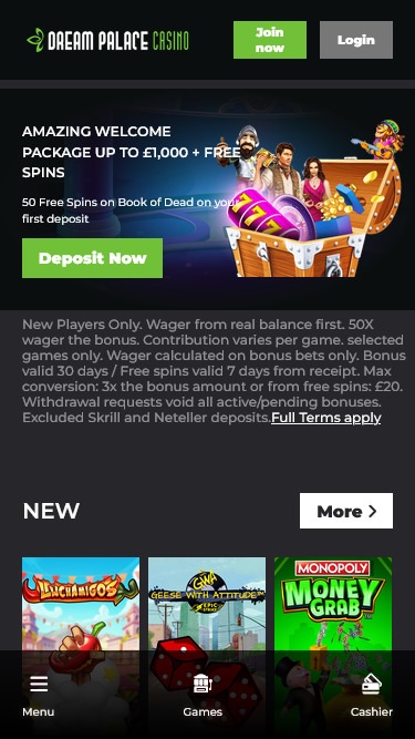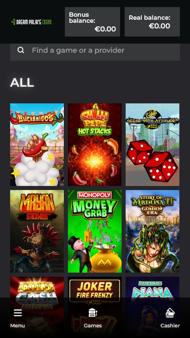 ड्रीम पैलेस कैसीनो Microgaming, Net Entertainment, 1x2gaming, Barcrest, Big Time Gaming, ELK Studios, Evolution Gaming, EYECON, lightningboxgames, Play'n GO, Rabcat, Thunderkick, Nolimit City, Red Tiger Gaming, Spinomenal, Skywind, Triple Edge Studios, Northern Lights Gaming, Stormcraft Studios, Switch Studios, All41 Studios, Gameburger Studios, Pulse 8 Studios, Neon Valley Studios, Shuffle Master, SpinPlay Games, Real Dealer Studios, GONG Gaming, On Air Entertainment, Buck Stakes Entertainment, Games Global, Blueprint Gaming, NextGen, ProgressPlay, Tom Horn Gaming, WMS, Inspired Gaming, SG Interactive, Red7Mobile, CORE Gaming, Scientific Games, Reel Time Gaming, Iron Dog Studio, Old Skool Studios, Foxium, Just For The Win, PearFiction Studios, Slingshot Studios, Fortune Factory Studios, Gamevy, Crazy Tooth Studio, Alchemy Gaming, Black Pudding Games, Snowborn Games, Hacksaw Gaming, SimplePlay, Gold Coin Studios, Half Pixel Studios, Aurum Signature Studios and Lucksome Gaming द्वारा संचालित है, जो इसे सैकड़ों खेलों की एक विविध लाइब्रेरी प्रदान करता है। कैसीनो एक वेब-आधारित प्लेटफ़ॉर्म के माध्यम से सुलभ है, और खिलाड़ी अपने मोबाइल उपकरणों पर भी साइट तक पहुँच सकते हैं।Blackjack