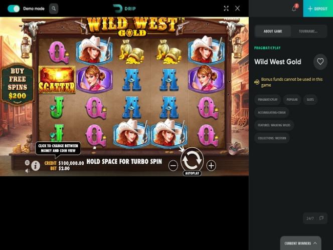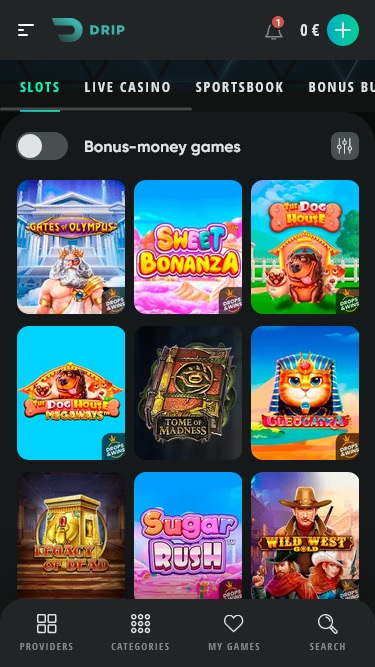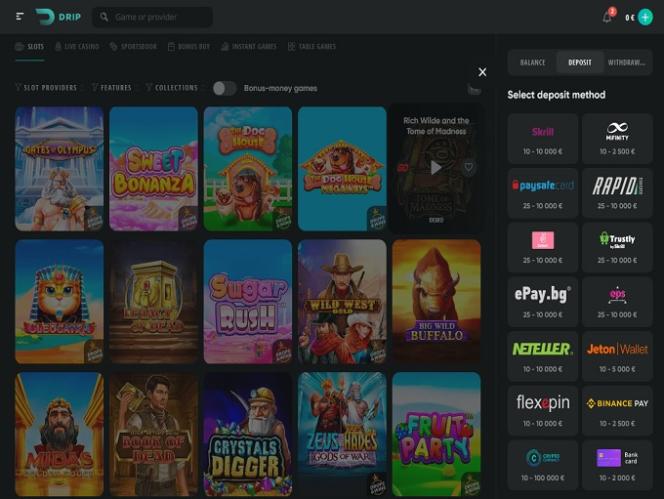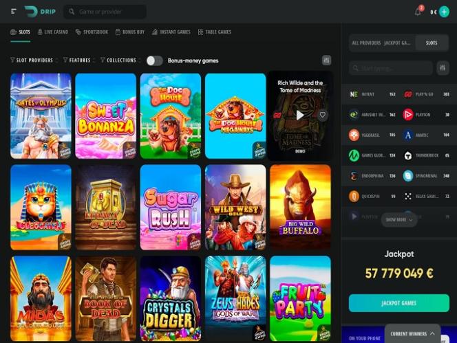 चूँकि ड्रिप कैसीनो में 100 से ज़्यादा अलग-अलग सॉफ़्टवेयर प्रदाता मौजूद हैं, इसलिए यहाँ ऑनलाइन स्लॉट्स का चयन काबिले तारीफ़ है। आपके लिए चुनने के लिए सैकड़ों से बढ़कर एक गेम उपलब्ध हैं, जिनमें सबसे लोकप्रिय हैं: बिग वाइल्ड बफ़ेलो, सैन क्वेंटिन xWays, ग्रीन चिली, स्पेस वॉर्स, क्लियोज़ बुक 50,000x, बिग हीस्ट, बफ़ेलो ट्रेल, गॉडेस ऑफ़ इजिप्ट, सकुरा फ़ॉर्च्यून, एल्विस फ्रॉग इन वेगास, और नेट गेन्स।