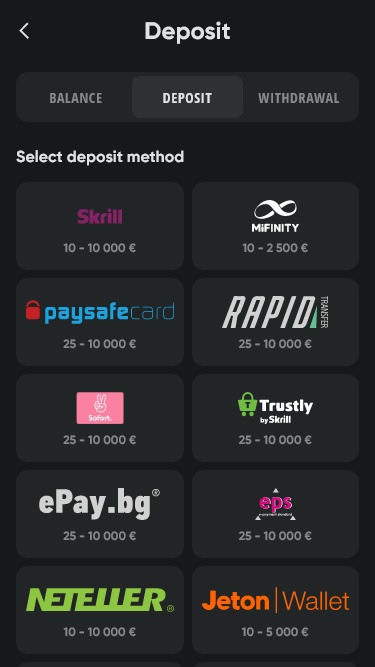 Reach PRIME level and get 5x wagering requiremnt ; Reach META level and get 3x wagering requiremnt. Available if your withdrawals do not exceed your deposits for the entire gaming period. Cashback percentage depends on the difference between total bets and total winnings or between total deposits and total withdrawals per week. Betwen 100 € – 200 € - 4%. Between- 201 € – 300 € - 5%; Betwen- 301 € – 500 € - 6%; Betwen- 501 € – 1 500 € - 7%; Betwen- 1 501 € – 3 000 € - 8%; Betwen- 3001 € – 6 000 € - 9%; 6 001 € and more - 10%.