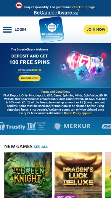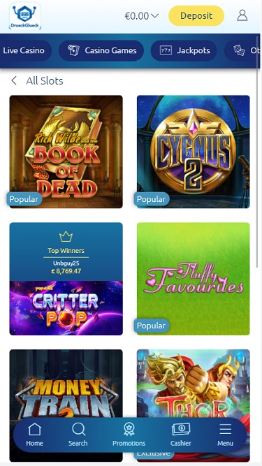 ड्रुएकग्लुएक कैसीनो एक ऑनलाइन सट्टेबाजी साइट है जो जर्मन सट्टेबाजी बाज़ार को सेवाएँ प्रदान करती है और श्लेस्विग-होल्स्टीन राज्य में संचालित होने वाली पहली लाइसेंस प्राप्त साइटों में से एक बन गई है। 2015 में शुरू हुआ यह कैसीनो कॉग्निटा टेक्नोलॉजीज़ लिमिटेड के स्वामित्व और संचालन में है, और इसकी शुरुआत एक विशाल गेमिंग लाइब्रेरी के साथ हुई है जो साइट पर आने वाले आगंतुकों के लिए काफ़ी उम्मीद जगाती है।