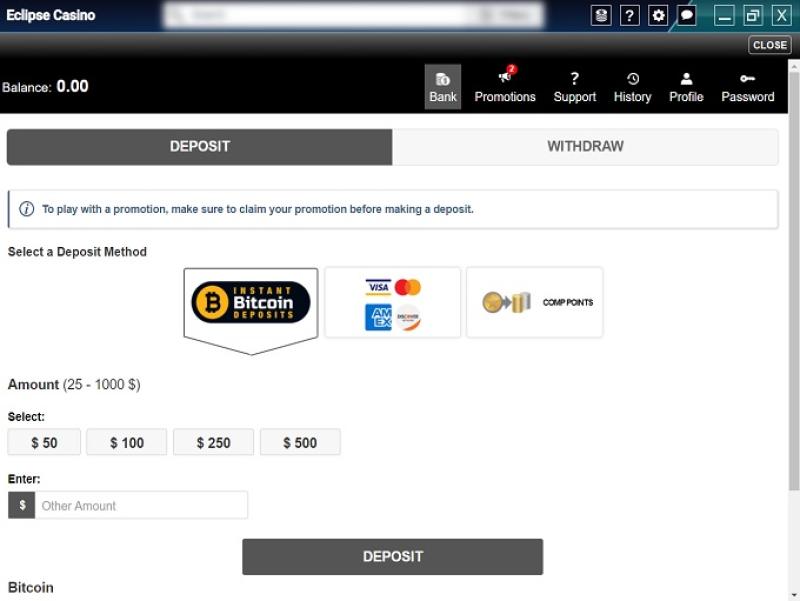 एक्लिप्स कैसीनो की बैंकिंग व्यवस्था बहुत अच्छी नहीं है, क्योंकि कैसीनो में निकासी की सीमा केवल $2,000 प्रति सप्ताह है, और भुगतान पूरा होने में 7-10 कार्यदिवस लगते हैं। यह देखते हुए कि यह साइट अमेरिकी सट्टेबाजी बाज़ार को कैसे सेवाएँ देती है, इनमें से कुछ प्रतिबंधों का होना स्वाभाविक है। जमा और निकासी मास्टरकार्ड, वीज़ा, स्क्रिल, नेटेलर, पेसेफ़कार्ड और वायर ट्रांसफ़र के माध्यम से की जाती है।