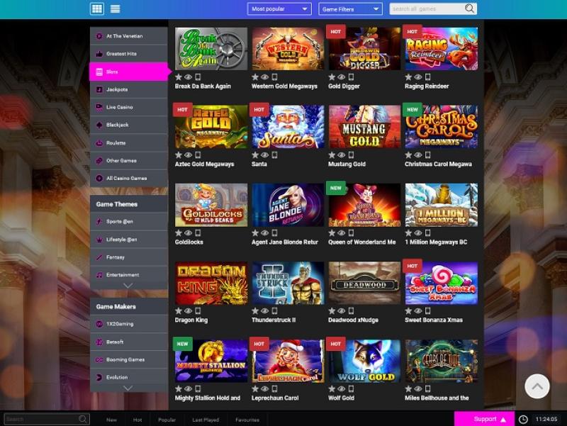 मुख्य खेल श्रेणियां हैं: एट द वेनेशियन, ग्रेटेस्ट हिट्स, स्लॉट्स, जैकपॉट्स, लाइव कैसीनो, ब्लैकजैक, रूलेट, अन्य खेल और सभी कैसीनो खेल।