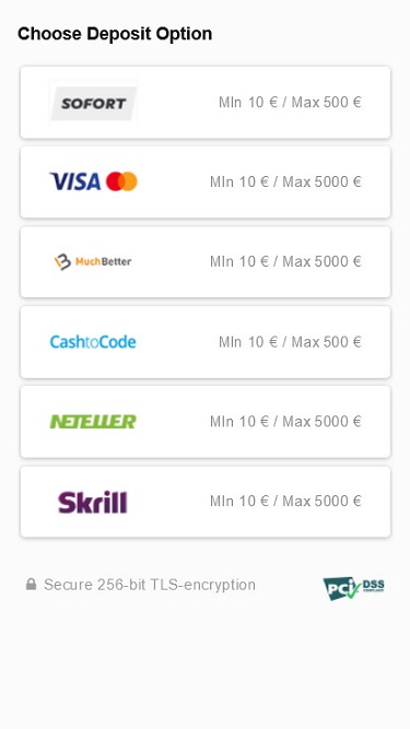 कैसीनो विश्वसनीय भुगतान विधियों का समर्थन करता है जिनका उपयोग सट्टेबाजों द्वारा व्यापक रूप से किया जाता है। खातों में धनराशि जमा की जा सकती है और साथ ही जीत की राशि को भुगतान कार्ड, ई-वॉलेट और प्रत्यक्ष बैंकिंग हस्तांतरण के माध्यम से भुनाया जा सकता है।