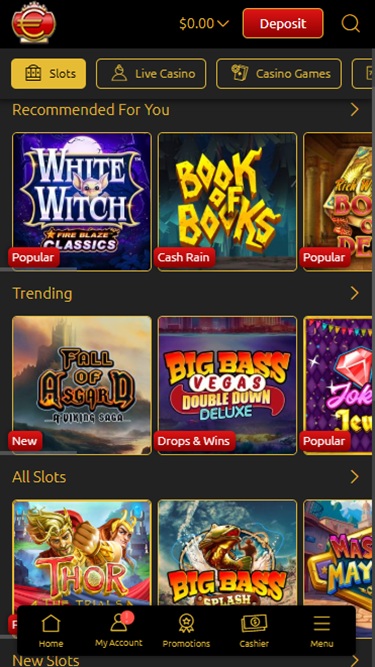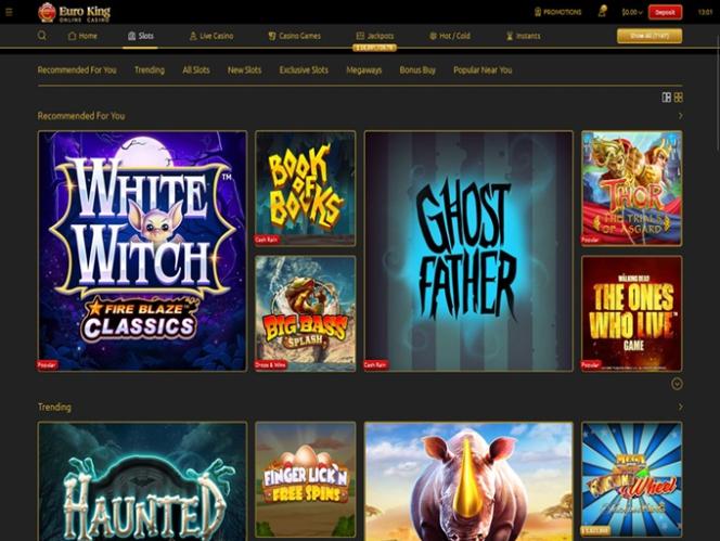 यूरोकिंग कैसीनो में खेलने के लिए बड़ी संख्या में स्लॉट उपलब्ध हैं, और साथ ही बड़ी संख्या में प्रगतिशील जैकपॉट भी उपलब्ध हैं, जिनमें शीर्ष पुरस्कार मिलियन डॉलर की रेंज तक पहुंच सकते हैं।