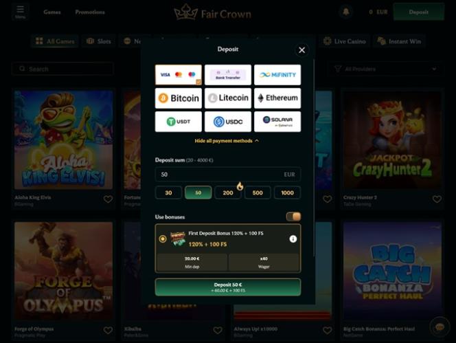 2026 में लॉन्च किया गया फेयर क्राउन कैसीनो एक जुआ साइट है जो ऑस्ट्रेलिया, न्यूजीलैंड, जर्मनी, ऑस्ट्रिया, स्विट्जरलैंड, डेनमार्क और नॉर्वे के खिलाड़ियों को स्वीकार करती है। इस ब्रांड में कैसीनो गेम्स का एक विशाल संग्रह है, जिसमें हजारों रियल-मनी स्लॉट, लाइव डीलर गेम्स, टेबल गेम्स और इंस्टेंट-क्रैश गेम्स शामिल हैं, साथ ही जुआ खेलने के अनुभव को बेहतर बनाने के लिए विभिन्न प्रमोशन और बोनस भी उपलब्ध हैं।