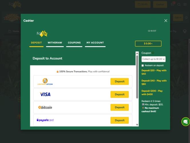 फेयर गो में बैंकिंग व्यवस्था अच्छी है, क्योंकि कैसीनो जमा और निकासी के लिए वायर ट्रांसफर, वीज़ा, बिटकॉइन, पेसेफकार्ड, नेटेलर, स्क्रिल और अमेरिकन एक्सप्रेस स्वीकार करता है। बिटकॉइन और ई-वॉलेट आपके पैसे निकालने के सबसे तेज़ तरीके हैं, क्योंकि आप 2-3 कार्यदिवसों में धनराशि प्राप्त कर सकते हैं। दुर्भाग्य से, निकासी की साप्ताहिक सीमा $2,500 है, जो काफी कम है।