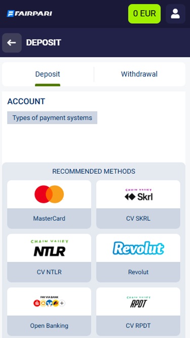 फेयरपारी कैसीनो विभिन्न भुगतान विधियां प्रदान करता है जैसे पोलकाडॉट, डैश, स्क्रिल, नेटलर, वीज़ा और मास्टरकार्ड , साथ ही कई क्रिप्टो विकल्प जैसे बिटकॉइन, बिटकॉइन कैश, कार्डानो, डॉगकोइन, एथेरियम, लाइटकोइन, रिपल, सोलाना, टीथर, टोन, ट्रॉन, यूएसडी कॉइन और ज़ेडकैश।
