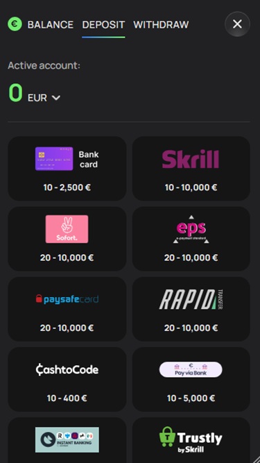 कैसीनो कई क्रिप्टोकरेंसी और यूरो को फिएट मुद्रा के रूप में स्वीकार करता है।
