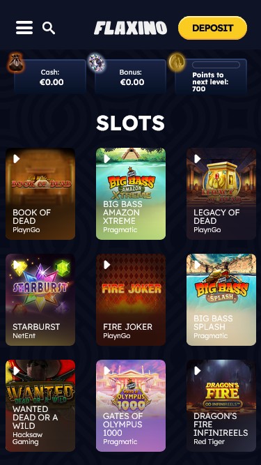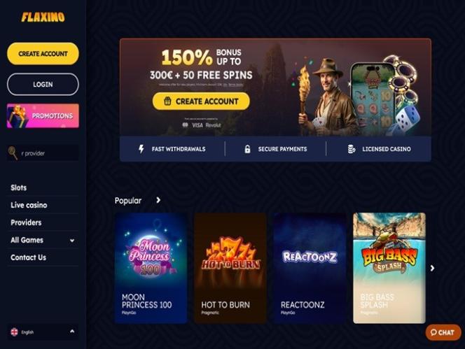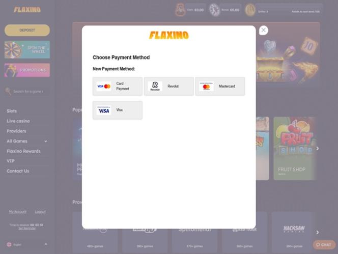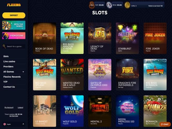 बाईं ओर आपको डिपॉजिट, स्पिन द व्हील, सर्च बार, स्लॉट्स, लाइव कैसीनो, प्रोवाइडर्स, ऑल गेम्स, फ्लेक्सिनो रिवॉर्ड्स, वीआईपी और हमसे संपर्क करें जैसे सेक्शन वाला एक मेनू मिलेगा।