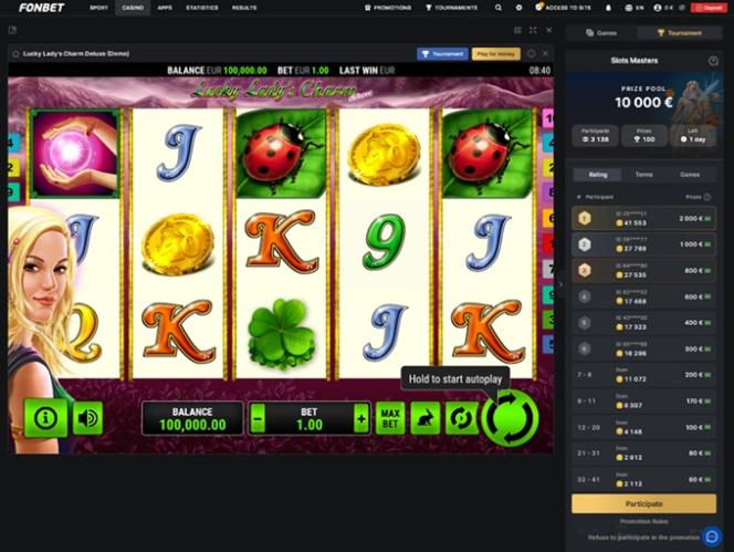 अधिकांश खिलाड़ी यह देखकर भी खुश होंगे कि फॉनबेट कैसीनो में प्रमोशन और बोनस की एक शानदार श्रृंखला उपलब्ध है। खाता बनाते ही, आप एक बड़ा स्वागत बोनस प्राप्त करने के पात्र होंगे, और बाद में, आप कैशबैक और रीलोड बोनस जैसे कई अन्य ऑफ़र का आनंद ले सकते हैं। कैसीनो नियमित रूप से टूर्नामेंट भी आयोजित करता है।