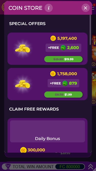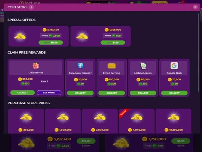 इससे पहले कि हम आपको यहाँ मिलने वाली सभी रोमांचक चीज़ों की सूची बनाएँ, आपको यह जान लेना चाहिए कि सभी गेम और सामग्री का अनुभव बिना कोई खरीदारी किए, बिल्कुल मुफ़्त में किया जा सकता है। यह सोशल कैसीनो खिलाड़ियों को बिना कोई पैसा खर्च किए, आभासी मुद्राएँ, सोने के सिक्के और फॉर्च्यून सिक्के कमाने की सुविधा देता है।