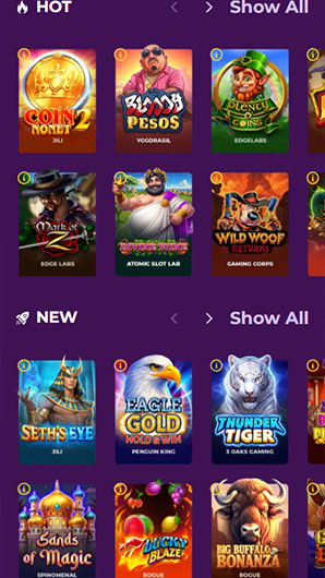 यहां उपलब्ध सभी गेम्स में कैसीनो-शैली के स्लॉट सबसे लोकप्रिय हैं, इसमें कोई आश्चर्य की बात नहीं है। कैटलॉग में सैकड़ों रोमांचक स्लॉट शामिल हैं, जिनमें मेगावे, बोनस बाय, होल्ड एंड विन (आप इस गाइड में लोकप्रिय होल्ड एंड विन गेम्स के बारे में अधिक जान सकते हैं), क्लस्टर पे, जैकपॉट, क्लासिक स्लॉट और नवीनतम रिलीज़ शामिल हैं।