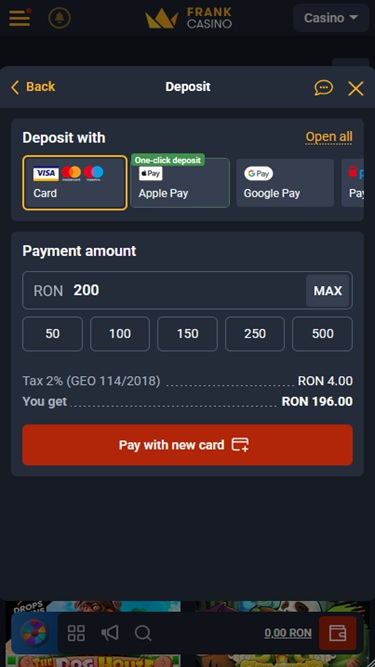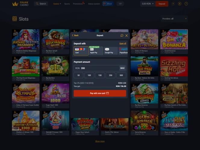 फ्रैंक कैसीनो Microgaming, Net Entertainment, Playtech, BetSoft, 1x2gaming, Amatic Industries, Big Time Gaming, ELK Studios, Evolution Gaming, EYECON, Ezugi, Genesis Gaming, Habanero Systems, iSoftBet, lightningboxgames, Novomatic, Oryx, Play'n GO, playson, Quickspin, Rabcat, Relax Gaming, Rival, Thunderkick, Yggdrasil, Endorphina, Wazdan, Realistic Games, GameArt, Betgames, Booming Games, Stakelogic, Pragmatic Play, Nolimit City, Felt Gaming, Red Tiger Gaming, Booongo, Spinomenal, Red Rake Gaming, Skillzzgaming, Fugaso, Belatra Games, Fantasma Games, SYNOT Games, Kalamba, Revolver Gaming, Spin Games, Skywind, Triple Edge Studios, Northern Lights Gaming, Fazi, Evoplay, Stormcraft Studios, Switch Studios, SA Gaming, Electric Elephant Games, Pocket Games Soft, Bulletproof Games, All41 Studios, Gluck Games, Mascot Gaming, Gameburger Studios, Pulse 8 Studios, Neon Valley Studios, Golden Rock Studios, Swintt, TrueLab Games, SpinPlay Games, SmartSoft Gaming, Real Dealer Studios, Blue Guru Games, On Air Entertainment, Buck Stakes Entertainment, Games Global, Amusnet Interactive, 2by2 Gaming, Ainsworth, Ash Gaming, bluberi, Blueprint Gaming, CT Interactive, Greentube, Push Gaming, Tom Horn Gaming, Inspired Gaming, Gamomat, Reel Time Gaming, Authentic Gaming, BF Games, betiXon, Iron Dog Studio, Old Skool Studios, Foxium, Just For The Win, Reflex Gaming, Storm Gaming Technology, Bla Bla Bla Studios, PearFiction Studios, Apollo Games, Wild Streak Gaming, Slingshot Studios, Golden Hero, Fortune Factory Studios, STHLM Gaming, RubyPlay, 4ThePlayer, AvatarUX, Gamevy, Crazy Tooth Studio, NetGaming, ReelPlay, Japan Technicals Games, Zonelock, Alchemy Gaming, Rarestone Gaming, Black Pudding Games, Snowborn Games, Boomerang Studios, Hacksaw Gaming, Max Win Gaming, Gold Coin Studios, Bang Bang Games, Gamzix, Half Pixel Studios, Arcadem, Slotmill, SilverBack Gaming, Peter And Sons, Aurum Signature Studios, Lucksome Gaming, Area Vegas, ELA Games, Leap Gaming, 3 Oaks Gaming, Wishbone Games, Spribe, Circular Arrow, Print Studios, Gaming Corps, HammerTime Games, Four Leaf Gaming, INO Games, Nailed It! Games, Atomic Slot Lab, Neko Games, Reel Kingdom, Oros Gaming, Givme Games, Indigo Magic, VoltEnt and Boldplay द्वारा संचालित है, और कैसीनो के गेम एक इंस्टेंट प्ले, वेब-आधारित प्लेटफ़ॉर्म के माध्यम से प्रदान किए जाते हैं जो सीधे आपके वेब ब्राउज़र के माध्यम से लोड होता है। कैसीनो मोबाइल प्ले को भी पूरी तरह से सपोर्ट करता है, यानी आप अपने स्मार्टफोन या टैबलेट के माध्यम से फ्रैंक कैसीनो के गेम खेल सकते हैं।