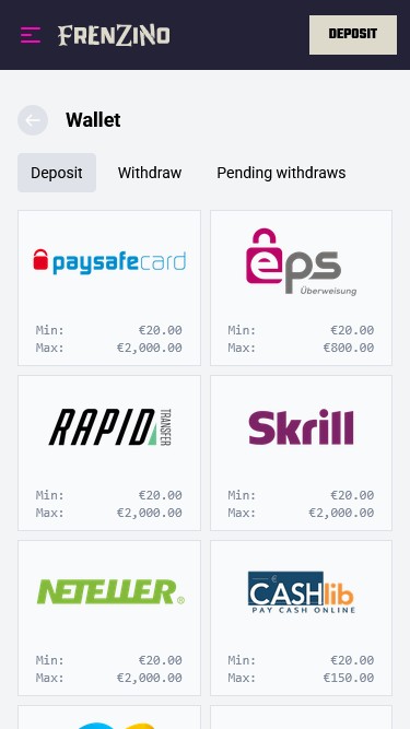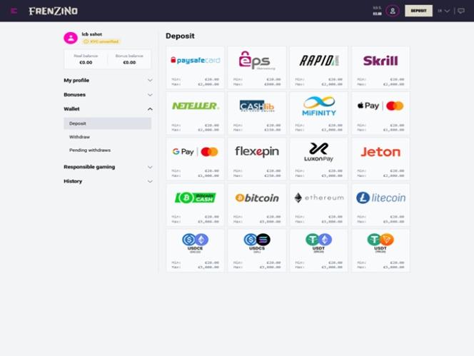 यदि आप जमा और निकासी के लिए क्रिप्टोकरेंसी का उपयोग करना पसंद करते हैं, तो आपको यह जानकर खुशी होगी कि फ्रेंज़िनो बिटकॉइन, एथेरियम और यूएसडीटी जैसी कई मुद्राओं को स्वीकार करता है।
