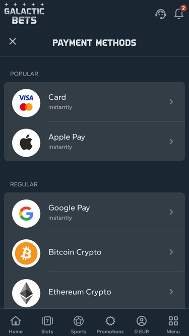 हालांकि हम लॉयल्टी प्रोग्राम के सभी फायदों के बारे में निश्चित रूप से नहीं कह सकते, लेकिन पारंपरिक बोनस और प्रमोशन के बारे में हम निश्चित रूप से बता सकते हैं। GalacticBets कई तरह के आकर्षक पुरस्कार प्रदान करता है, जिसकी शुरुआत एक बड़े वेलकम बोनस से होती है जिसमें स्पोर्ट्स बेटर्स और कैसीनो प्लेयर्स दोनों के लिए कई डिपॉजिट-मैचिंग ऑफर शामिल हैं।