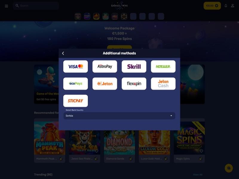 इस प्लेटफ़ॉर्म पर नेविगेट करना बेहद आसान है। पंजीकरण प्रक्रिया में दो त्वरित, सरल चरण और ईमेल सत्यापन शामिल हैं। साइन-अप पूरा करने के बाद, पंटर्स गैलेक्सीनो की शानदार ढंग से व्यवस्थित गेम श्रेणियों को ब्राउज़ करते हुए एक स्वागत बोनस पैकेज प्राप्त कर सकते हैं।