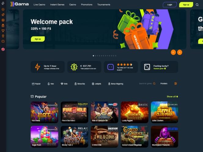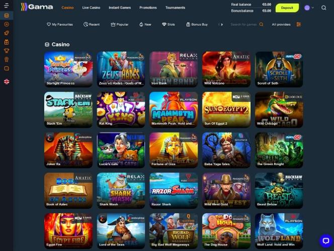 गामा कैसीनो में बड़ी संख्या में सॉफ्टवेयर प्रदाताओं की मौजूदगी के साथ, खिलाड़ी कई अलग-अलग ऑनलाइन स्लॉट्स खेल सकेंगे जो मज़ेदार और रोमांचक हैं। गामा कैसीनो में खिलाड़ियों द्वारा पसंद किए जाने वाले सबसे लोकप्रिय गेम इस प्रकार हैं: शुगर रश, एलियन फ्रूट्स, स्वीट बोनान्ज़ा, कैश ट्रक 2, बुक ऑफ़ फ़ॉर्च्यून, कैंडी ब्लिट्ज़, रिची हॉग और गेट्स ऑफ़ ओलिंपस।
