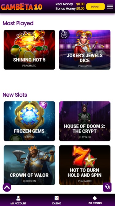 लेकिन, हमेशा की तरह, हमारा ध्यान कैसीनो बोनस पर है, तो आइए Gambeta10 पर कैसीनो और लाइव कैसीनो प्रोमो टैब पर नज़र डालें।