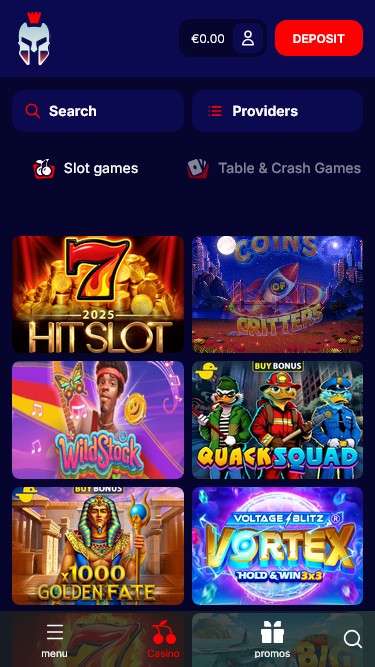 दाईं ओर देखने पर आपको डिपॉजिट बटन, प्रोफाइल बटन, अकाउंट बैलेंस, भाषा बदलने के विकल्प और लाइव चैट खोलने का बटन मिलेगा। इसके अलावा, सर्च बटन भी है, जो सर्च बार खोलता है और आपको अपने पसंदीदा गेम, प्रोवाइडर या कैटेगरी को तुरंत ढूंढने में मदद करता है!