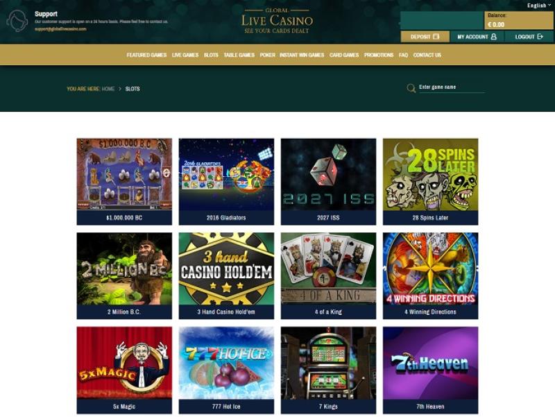 ग्लोबल लाइव कैसीनो में खेलने के लिए स्लॉट्स का एक अच्छा चयन उपलब्ध है, हालांकि खेलों की संख्या अन्य सट्टेबाजी साइटों की तुलना में बहुत कम है।
