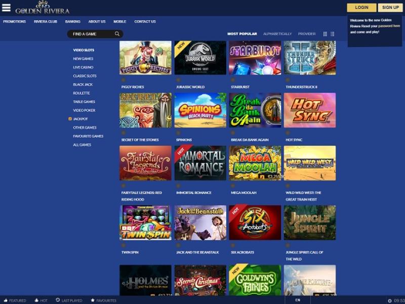 गोल्डन रिवेरा कैसीनो में आपको ढेरों स्लॉट मिलेंगे, क्योंकि यह कैसीनो माइक्रोगेमिंग के गेम्स की पूरी रेंज प्रदान करता है। आपको यहाँ पारंपरिक वीडियो स्लॉट्स के कई रूप मिलेंगे, साथ ही मेगा मूलाह, किंग कैशलॉट और मेजर मिलियन्स जैसे कई प्रोग्रेसिव जैकपॉट भी मिलेंगे।