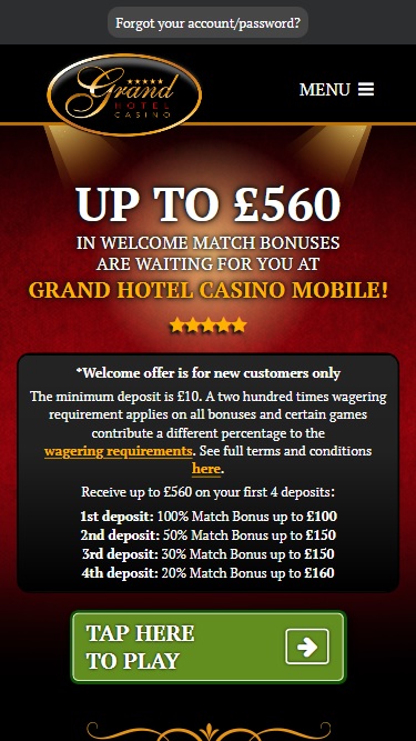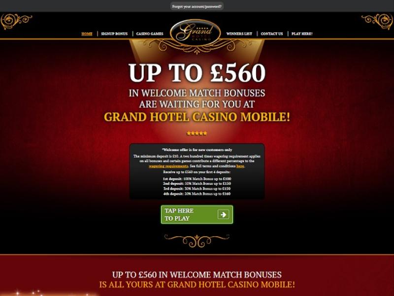 Grand Hotel Casino एक ऑनलाइन सट्टेबाजी साइट है जो 1990 के दशक के अंत से चल रही है। इस कैसीनो का स्वामित्व और संचालन कैसीनो रिवार्ड्स द्वारा किया जाता है, जो कई अन्य ऑनलाइन कैसीनो भी चलाता है, और इन सभी को खिलाड़ियों और उद्योग के जानकारों द्वारा खूब सराहा जाता है। Grand Hotel Casino के सट्टेबाज कैसीनो के प्रबंधन, विशाल गेमिंग लाइब्रेरी और तेज़ भुगतान इतिहास का आनंद लेते हैं।कैसीनो जानकारी
