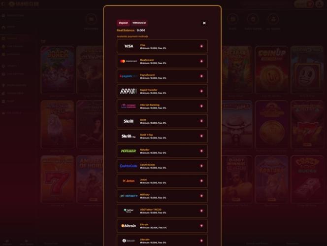 हमें खुशी है कि ग्रैंड क्लब कैसीनो के खिलाड़ी बिटकॉइन, डॉगकॉइन, लाइटकॉइन और टीथर जैसी क्रिप्टोकरेंसी सहित कई भुगतान विधियों से जमा और निकासी कर सकते हैं। कुछ पारंपरिक भुगतान विकल्पों में क्रेडिट कार्ड और वीज़ा , मास्टरकार्ड , MiFinity , जेटन , नेटेलर , स्क्रिल जैसे इलेक्ट्रॉनिक वॉलेट और बैंक वायर ट्रांसफ़र शामिल हैं।