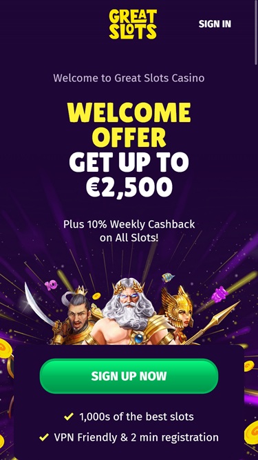 ग्रेट्स स्लॉट्स कैसीनो एक जुआ साइट है जो अपने नाम के अनुरूप ही काम करती है: यह खिलाड़ियों के लिए अभूतपूर्व संख्या में ऑनलाइन स्लॉट गेम उपलब्ध कराती है। इसके अलावा, यह ब्रांड लाइव डीलर्स और टेबल गेम्स की एक मजबूत श्रृंखला के साथ-साथ कई आकर्षक प्रमोशन और बोनस भी प्रदान करता है। यह कैसीनो ऑस्ट्रेलिया, यूनाइटेड किंगडम और फ्रांस के खिलाड़ियों को स्वीकार करता है।