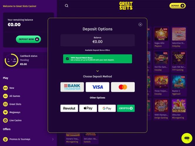 भुगतान विधियों के संबंध में, ग्रेट स्लॉट्स कैसीनो धन जमा करने और निकालने के लिए कई विकल्प प्रदान करता है, जिनमें वीज़ा , मास्टरकार्ड, बैंक वायर ट्रांसफर , गूगल पे , एप्पल पे और रिवोल्यूट शामिल हैं। इसके अलावा, खिलाड़ी बिटकॉइन , बिटकॉइन कैश , डॉगकॉइन, एथेरियम, कार्डानो , टोनकॉइन , सोलाना, ट्रॉन , यूएसडी कॉइन , टेथर और रिपल सहित कई क्रिप्टोकरेंसी में धन जमा और निकाल सकते हैं।