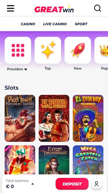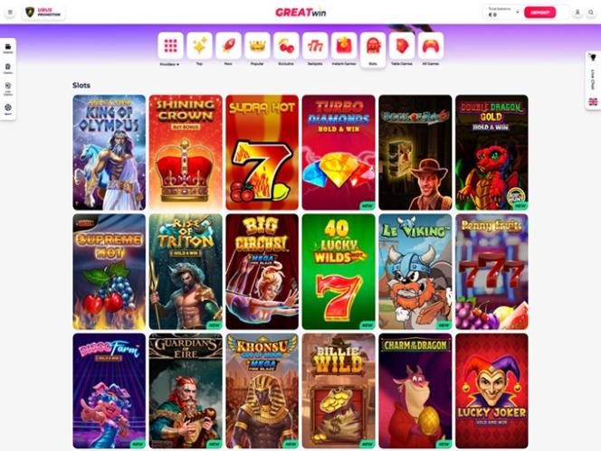 ग्रेटविन कैसीनो द्वारा सुझाए गए स्लॉट गेम हैं: पिग्गी ब्योर्न - मुस्पेलहेम का खजाना, एल टोरेओ, एल काउबॉय मेगावेज़, बॉबी वुड्स, बुक ऑफ़ सीक्रेट्स, एल्वेन प्रिंसेस, मेगा ग्रेटेस्ट कैच, 40 सेवेन्स, अरेबियन सीक्रेट, सर्फिन जोकर, आउट ऑफ़ द आइस, रॉयल पोटैटो, बुक ऑफ़ डेस्टिनी, क्रिस्टल गोलेम, वज़ाम्बा, अमेज़न किंगडम, गेट्स ऑफ़ ओलंपस, बिगर बास बोनान्ज़ा, 1 मिलियन फॉर्च्यून्स मेगावेज़, बुक ऑफ़ रैम्पेज, पावर ऑफ़ गॉड्स: हेड्स, जगुआर प्रिंसेस, बिग बैड वुल्फ मेगावेज़, लायन होर्ड, रेज़र शार्क, फिगारो, लकी रूस्टर, बुक ऑफ़ सन: चॉइस, ग्रेट बुक ऑफ़ मैजिक, बुक ऑफ़ साइरन्स - गोल्डन पर्ल, द बोवेरी बॉयज़, रेनो 7's, द मिस्ट्री ऑफ़ एल्डोरैडो, सैन क्वेंटिन xWays, बिग बास बोनान्ज़ा, जोकर विन, फ़ायर इन द होल xBomb, फैट ड्रैक, साइबेरियन वुल्फ, स्वीट बोनान्ज़ा, सकुरा फॉर्च्यून, ब्लैक वुल्फ: होल्ड एंड विन, वुल्फ फैंग, इट्स जोकर, रैम्सेस राइजिंग, बफैलो पावर होल्ड एंड विन, गोल्डन ग्लिफ़ 2, डेडवुड xNudge, जैमिन'जार, स्टिकी बैंडिट्स: वाइल्ड रिटर्न, बुक ऑफ़ डायमंड्स, टाइगर्स ग्लोरी, 10000 विशेज़, क्यूब मेनिया डीलक्स, क्यूब मेनिया, हैलो पिक, सुपर सेवेन्स एंड फ्रूट्स 6 रील्स, 8 गोल्डन स्कल्स ऑफ़ होली रोजर मेगावेज़ फायरपॉट, ट्रेज़र्स ऑफ़ लायन सिटी, रेट्रो गैलेक्सी, बुशी सुशी, डार्क रील्स, वेल ऑफ़ वाइल्ड्स मेगावेज़, पिग्गी बैंक बिल्स, अटलांटिस कैश कलेक्ट, रेट्रो कद्दू...