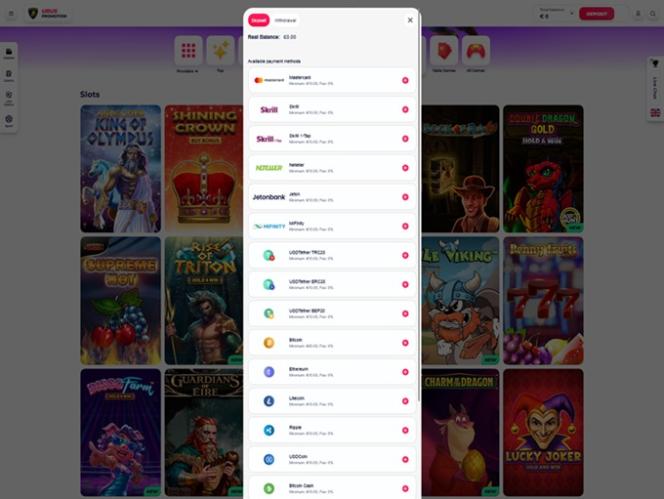 "कैशियर" अनुभाग उनके जुआ क्षेत्राधिकार में उपलब्ध विभिन्न भुगतान विकल्प प्रदान करता है, जिसमें क्रिप्टो बैंकिंग विधियां , प्रीपेड, क्रेडिट और डेबिट कार्ड, ई-वॉलेट, तत्काल बैंक स्थानान्तरण शामिल हैं...